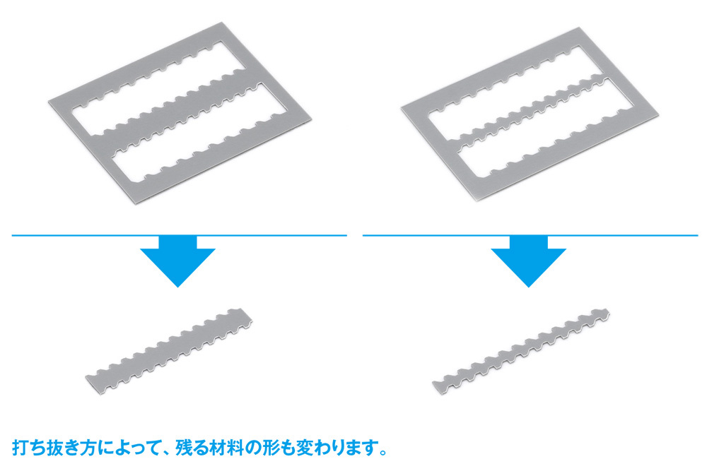 Continuous shapes can be punched out with one touch, making mass production of parts easy.